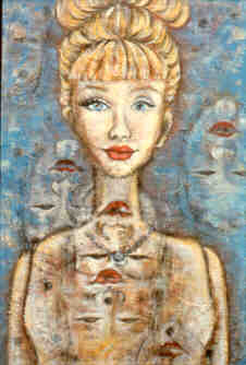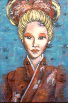 Barbie v/s Okame(triptych)2000,oil on linen 35.5”x24”